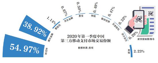 但按照目前的形势来看,支付宝市场份额或许更高一些。根据易观发布的《中国第三方支付移动支付市场季度监测报告2020年第1季度》数据,支付宝交易份额为54.97%,腾讯金融则为38.92%,而美团旗下的第三方支付公司钱袋宝交易份额则并未单独列出,可见占比并不大。