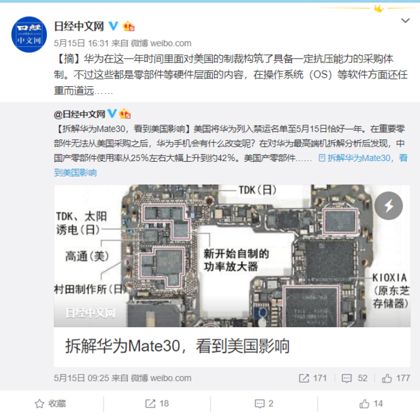 在美国对华为“卡脖子”进一步升级的同时,日本经济中文网报道,在日本专业调查公司Fomalhaut?Techno?Solutions的配合下,对华为Mate30?5G版进行拆解发现,在受到制裁之后,中国产零部件的使用率按金额计算已经从25%左右大幅上升到约42%。与此同时,美国产零部件则从11%左右降到了约1%。