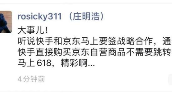 “狗快”联手,显得意味深长。此前,该合作就已经在圈内流传,经纬中国的副总裁庄明浩在朋友圈评论表示:“马上618,精彩。。。”