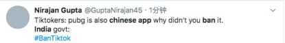 腾讯系虽然有一众产品在被封禁名单中,贡献最多营收的《绝地求生》(pubg)却逃此一劫,一名印度的抖音用户注意到这点,还在twitter中对此发出质疑。