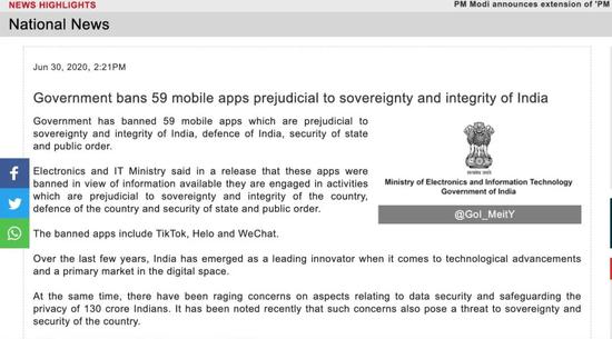 对此,印度电子信息技术部表示:“根据印度信息技术法案第六十九条第一款,这些应用程序已经对印度国家安全防卫构成威胁,最终将影响到印度主权完整性,是一个非常急迫的问题,必须采取紧急措施。”